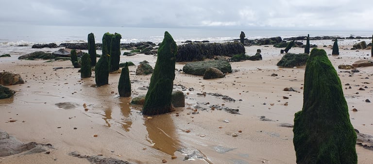 Seawick Beach, near St. Osyth in Essex blurs the line between the natural and artificial, as a strange assortment of jetsam sits among brightly coloured flint shingle, and samphire in the marshes behind the dunes turns shocking pink for autumn.